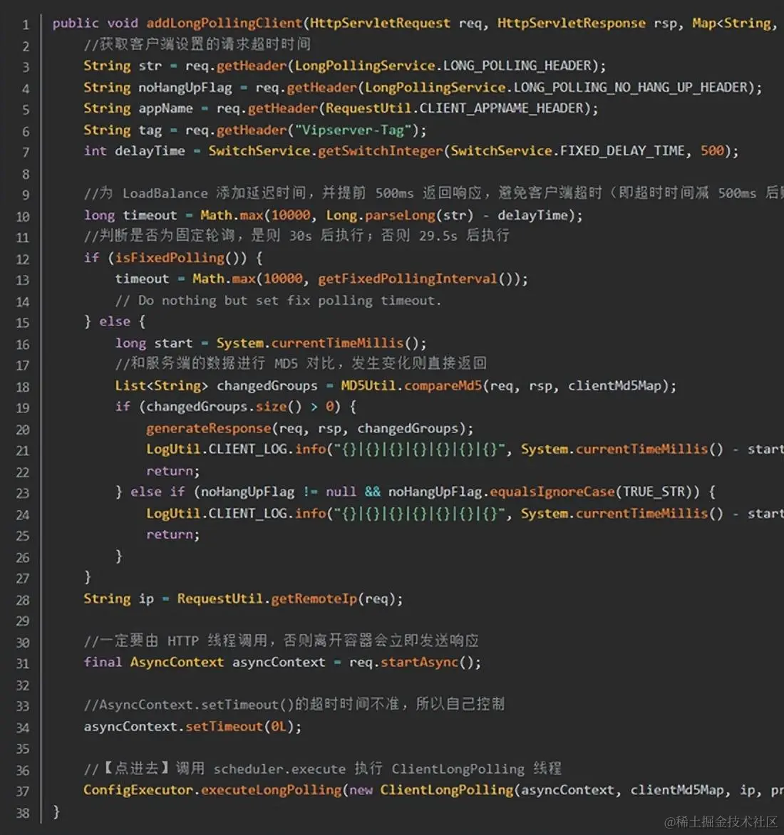LongPollingService.addLongPollingClient() 方法,里面是长轮询的核心处理逻辑,主要作用是把客户端的长轮询请求封装成 ClientPolling 交给 scheduler 执行;