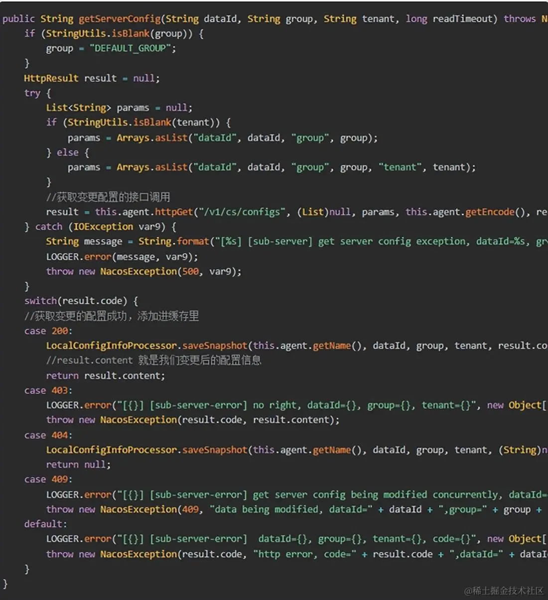 - 获得这些信息之后,在LongPollingRunnable.run() 方法中调用 getServerConfig() 去 Nacos 服务器上读取具体的配置内容;