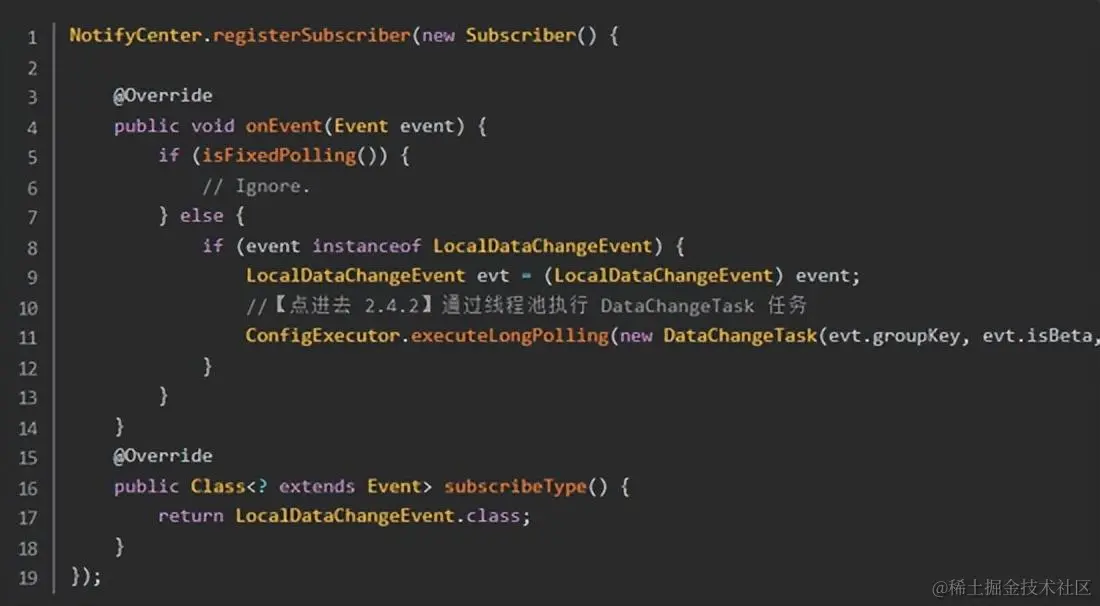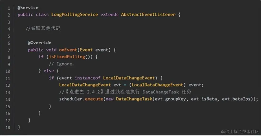 在 Nacos 1.3.1 版本之前,通过 LongPollingService 继承 AbstractEventListener 实现监听,覆盖 onEvent() 方法;