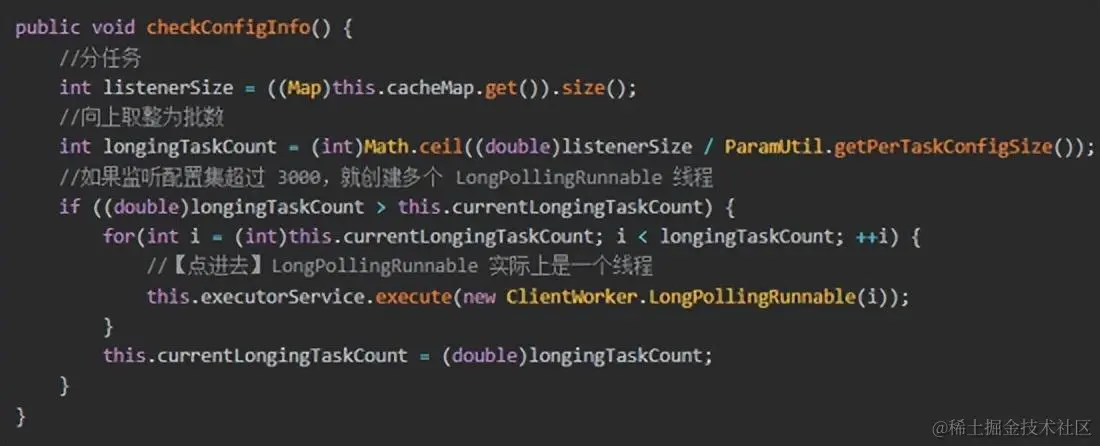 - 长轮询任务拆分:默认情况下,每个长轮询 LongPollingRunnable 任务处理3000个监听配置集。如果超过3000个,则需要启动多个 LongPollingRunnable 去执行;