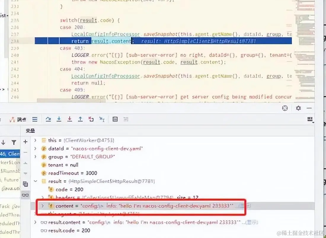注意:这里的断点需要注意 Nacos 服务器上修改配置(间隔大于 30s),进入后才好理解;