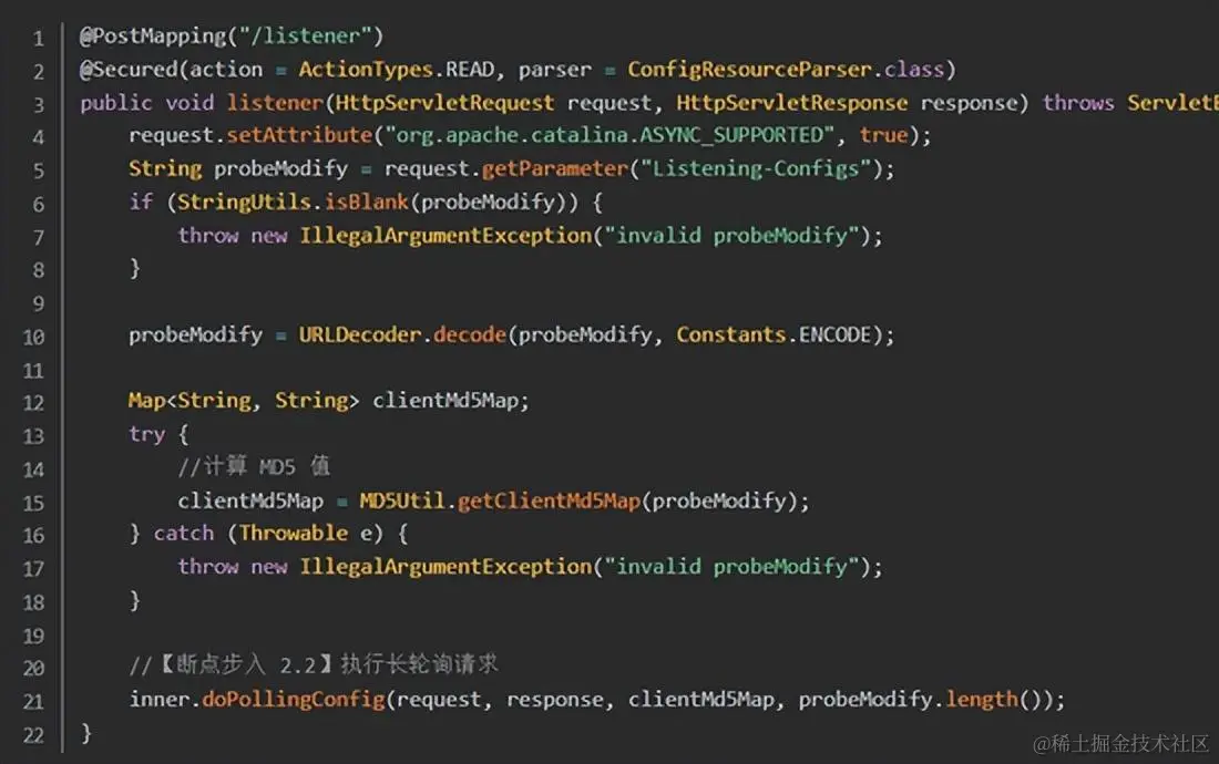 在 nacos-config 模块下的 controller 包,提供了个 ConfigController 类来处理请求,其中有个 /listener 接口,是客户端发起数据监听的接口,其主要逻辑和源码如下:
