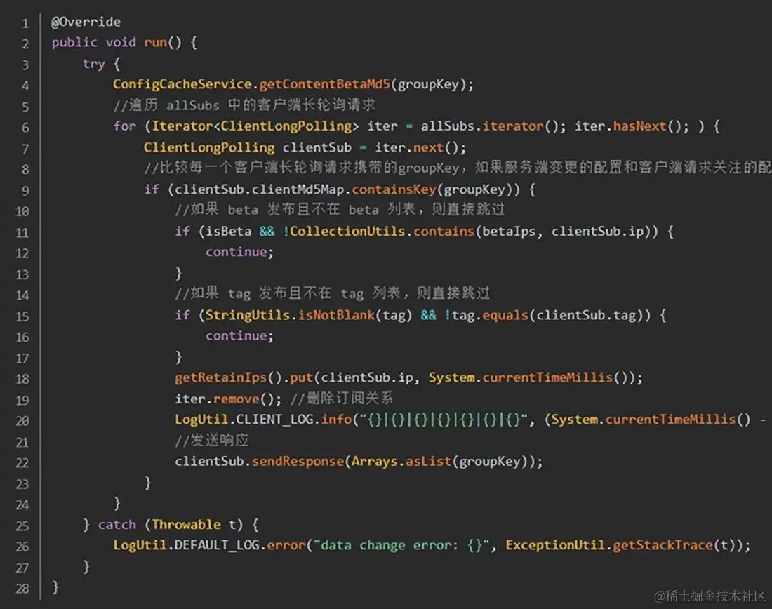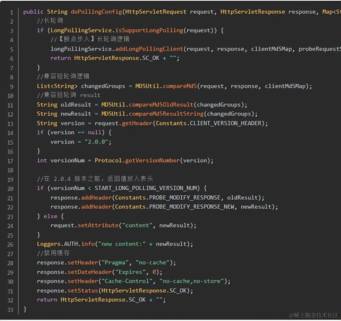 ConfigServletInner.doPollingConfig() 方法,该方法封装了长轮询的实现逻辑,同时兼容短轮询逻辑;