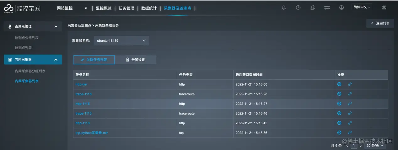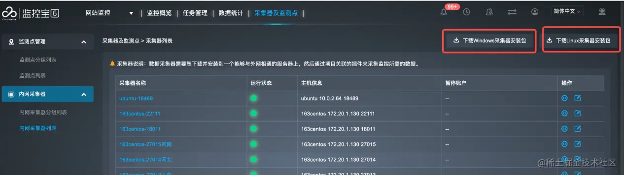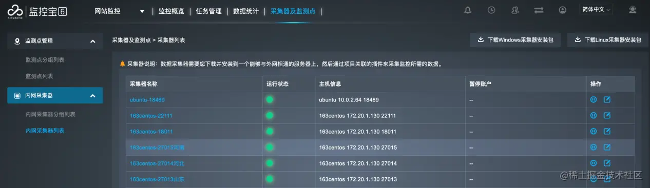 运行采集器后,可在监控宝6的采集器列表中查看采集器的运行状态,并对内网采集器进行管理。