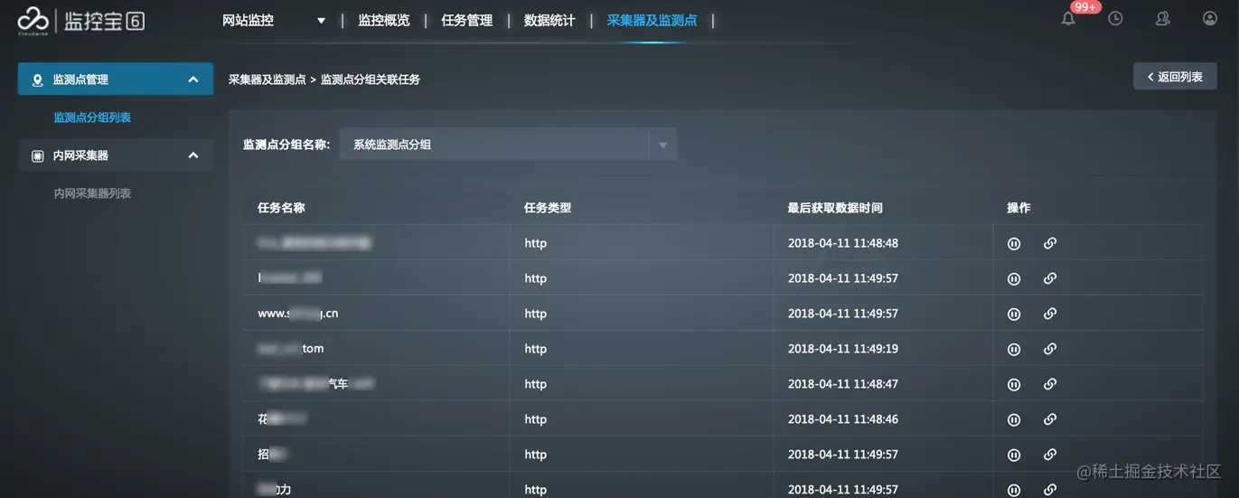 在监测点管理的监测点分组列表页面,您能够对监测点分组以及分组下的监控任务进行统一的管理。