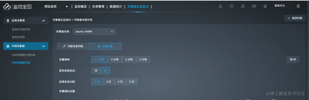 内网采集器是监控宝平台实现内网采集的核心组件,为保证内网监控任务的正常运行,内网采集器必须正常工作。当内网采集器不能稳定进行数据采集时,必须及时向管理员告警。在内网采集器列表中单击采集器名称,进入采集器关联任务列表页面,选择告警设置页签进行采集器的告警设置。