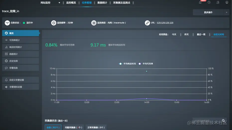 在监测点分组关联任务列表中单击监控任务的名称(或者单击监测任务对应的【链接按钮】),页面将跳转到监控任务的详情页面,在该页面可以查看监控任务的状态、频率、类型、URL、概览、可用率统计、响应时间统计、历史快照、告警消息等信息。
