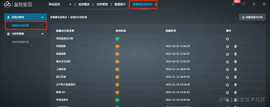 配置入口:网站监控>采集器及监测点>监测点管理>监测点分组列表