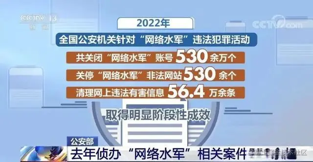 2022年,全国公安网安部门紧紧依托“净网2022”专项行动,依法严厉打击整治“网络水军”违法犯罪活动,共侦办“网络水军”相关案件550余起,关闭“网络水军”账号530余万个,关停“网络水军”非法网站530余个,清理网上违法有害信息56.4万余条。