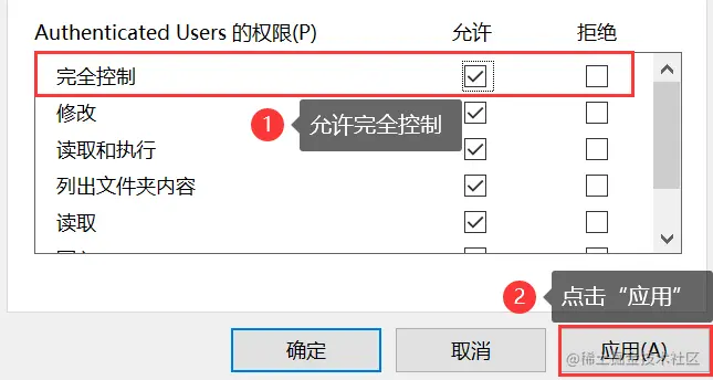 (3)在【权限】区域,确保 【完全控制】 中 【允许】复选框被选中;