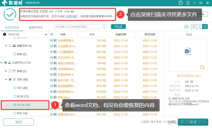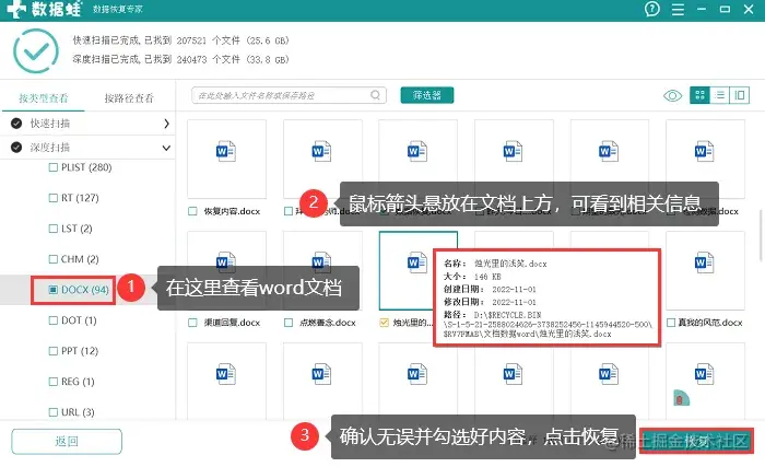 (4)扫描结果出来后,将鼠标悬放可查看相关信息,确认好无误且勾选好要恢复的内容后点击 【恢复】 ;