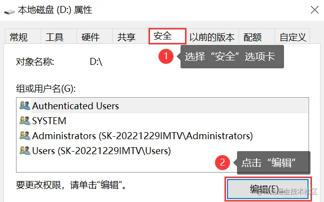 (2)选择【安全】选项卡,单击 【编辑】 按钮,选择当前用户;