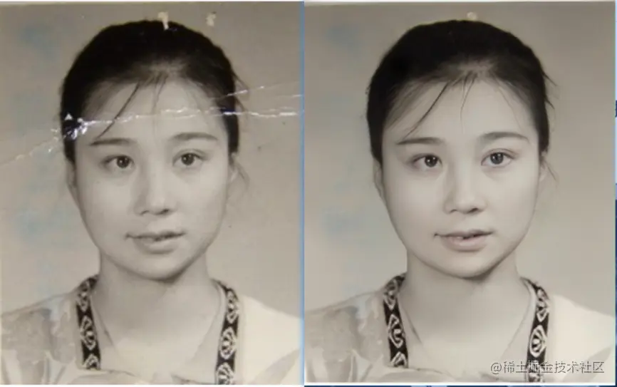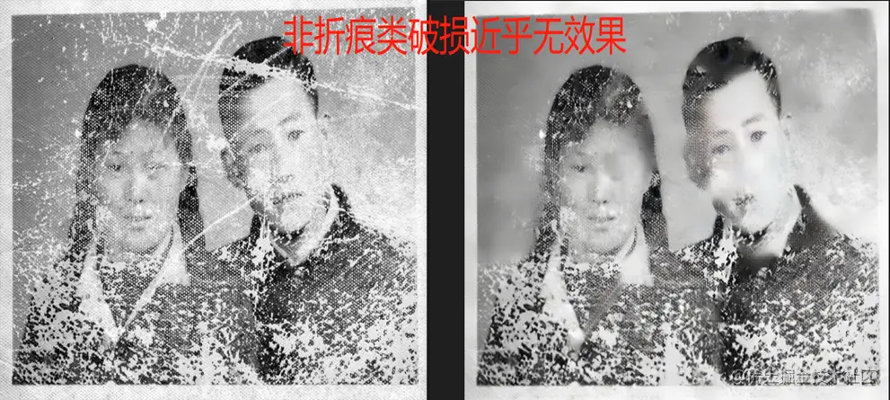 - 可以修复的图片主要要求,第一尽量折痕不要在人物五官上,且不要太深 第二就是可以处理的类型具体哪些目前还没有测试很多,示例那种破损就可以修复,但是以下的就无法修复