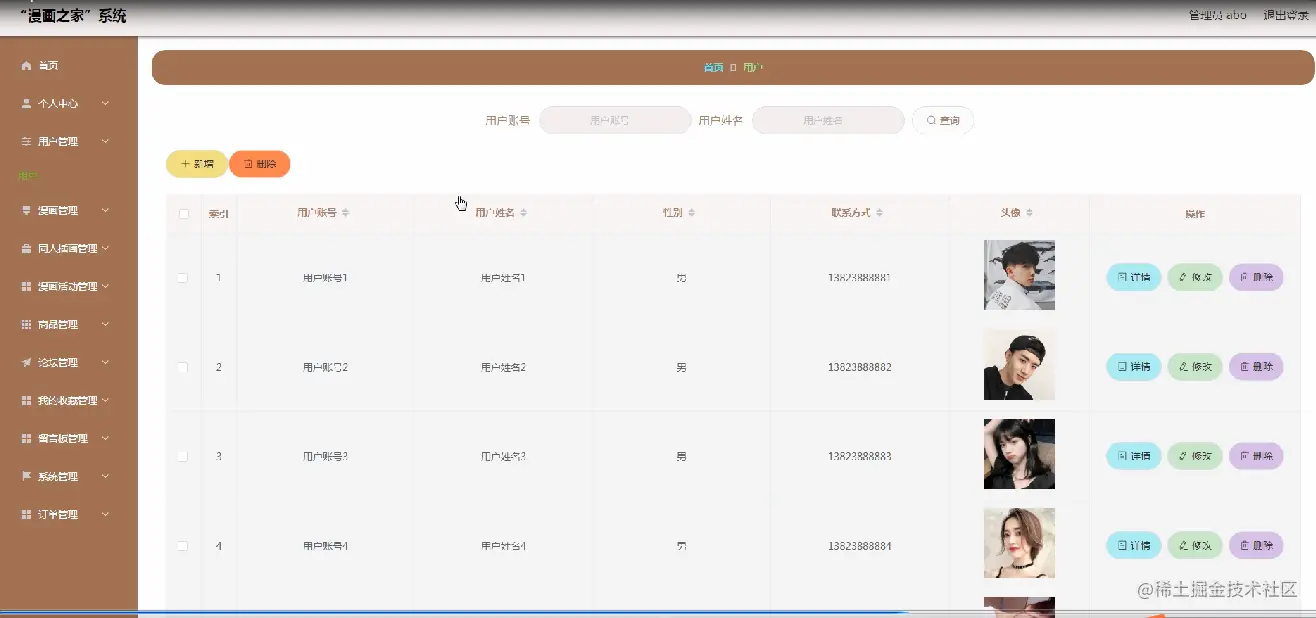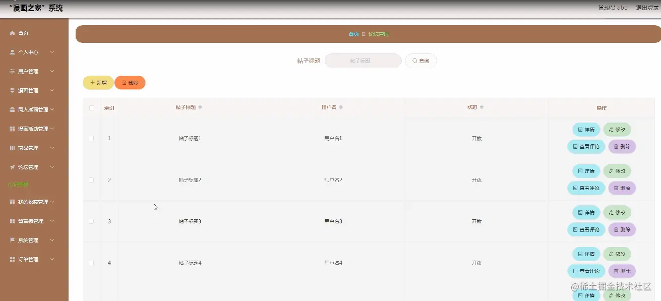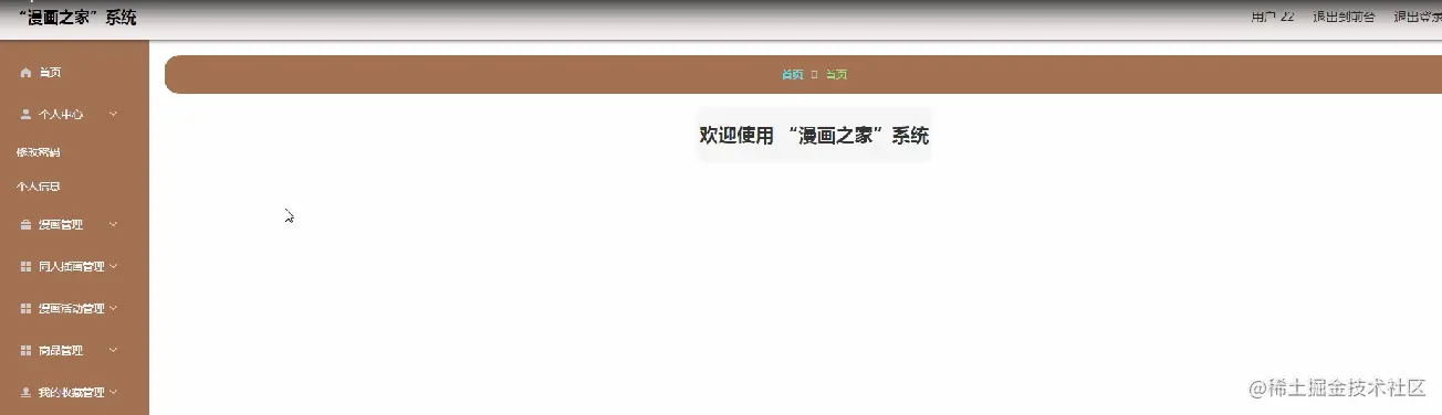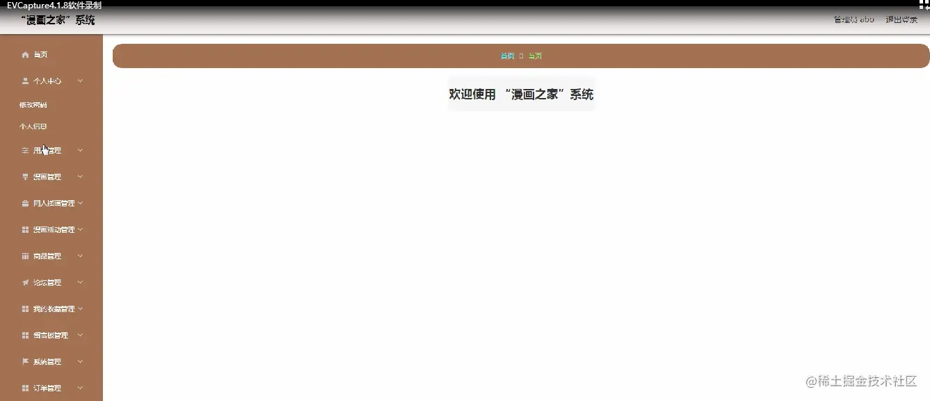 管理员登录进入系统可以查看首页,个人中心,用户管理,漫画管理,同人插画管理,漫画活动管理,商品管理,论坛管理,我的收藏管理,留言板管理,系统管理,订单管理等功能,并进行详细操作,如图5-6所示。