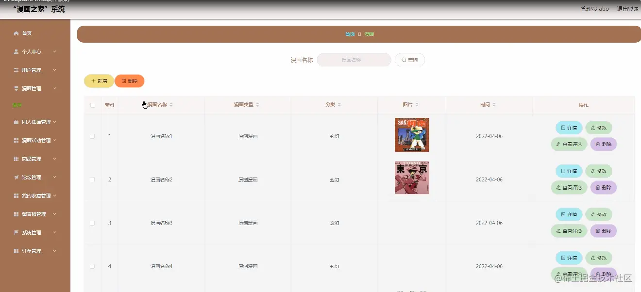 漫画管理;在漫画管理页面中可以查看索引,漫画名称,漫画类型,分类,图片等内容,并进行详情,修改,查看评论和删除操作;如图5-8所示。