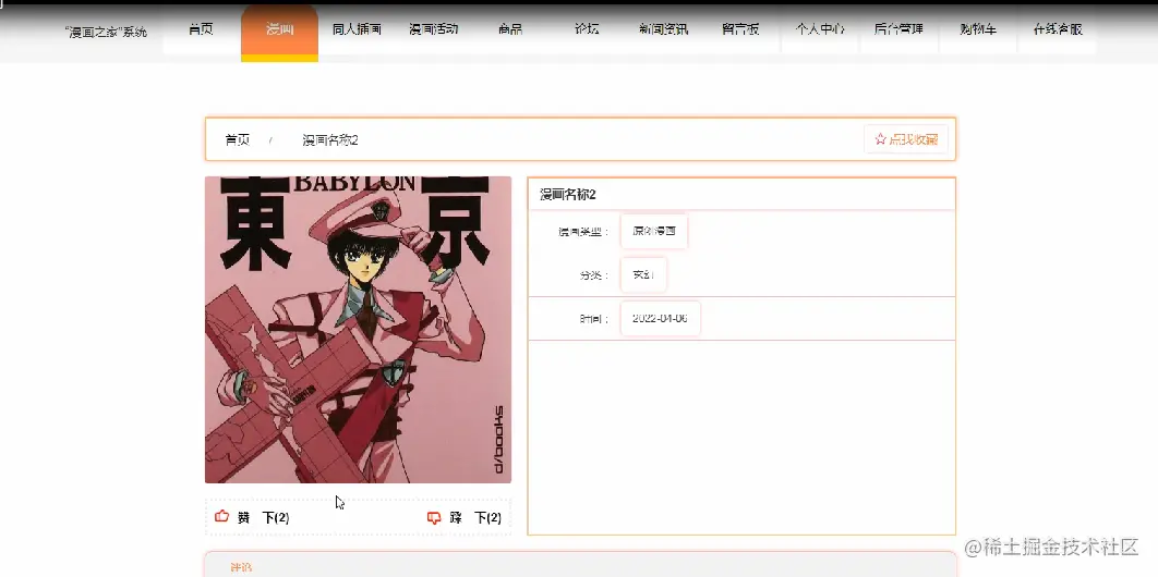 漫画,在漫画页面可以查看漫画名称,漫画类型,分类,时间等内容,并可以进行赞一下,踩一下,点我收藏等操作,如图5-3所示。