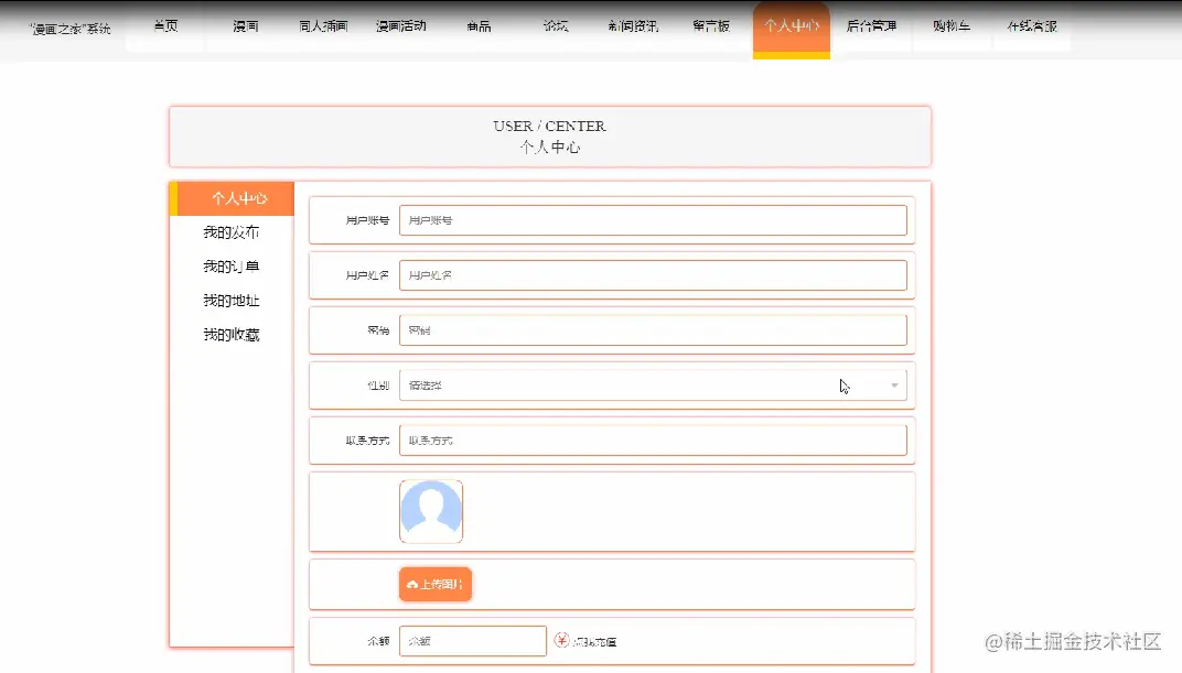 个人中心,在个人中心页面通过填写用户账号,用户姓名,密码,性别,联系方式,图片,余额等内容进行更新信息,还可以根据需要对我的发布,我的订单,我的地址,我的收藏进行相对应操作,如图5-4所示。
