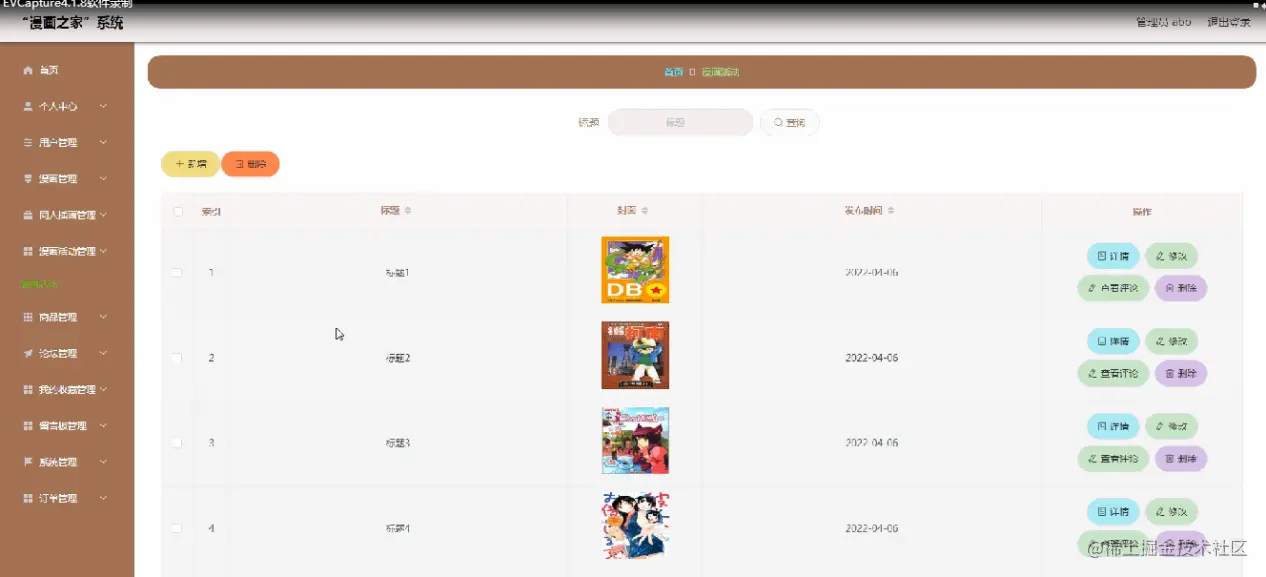 漫画活动管理;在漫画活动管理页面中可以查看 索引,标题,封面,发布时间等内容,并进行详情,修改,查看评论和删除操作;如图5-10所示。