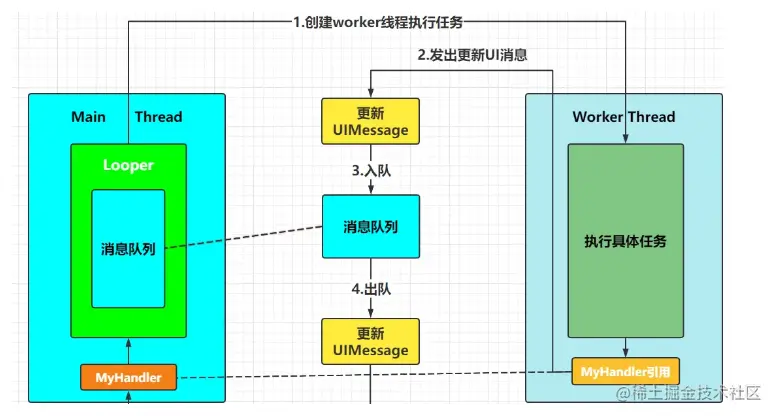 在子线程中,进行耗时操作,执行完操作后,发送消息,通知主线程更新UI。