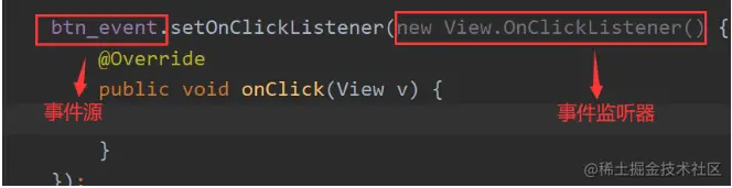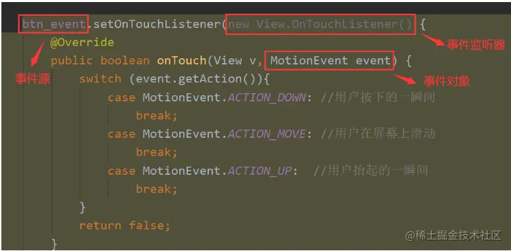 Event source 事件源 Event 事件 Event Listener 事件监听器 下面我们来看一下点击事件和触摸事件的监听三要素具体是那部分: