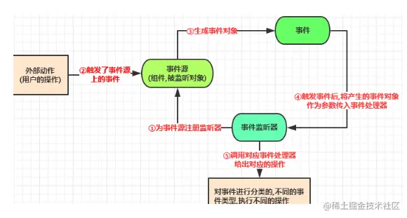 事件监听机制是一种委派式的事件处理机制,事件源(组件)事件处理委托给事件监听器 当事件源发生指定事件时,就通知指定事件监听器,执行相应的操作