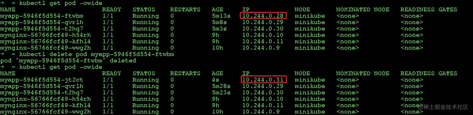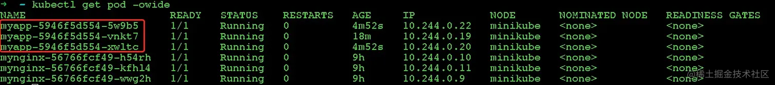 扩容之后可以看到同时存在5个myapp pod服务,这在实际场景中是非常有用的。当我们的服务压力过大、负载过高时,就可以通过该方式实现服务扩容,使得服务可以提供更高的并发能力,渡过高峰期。