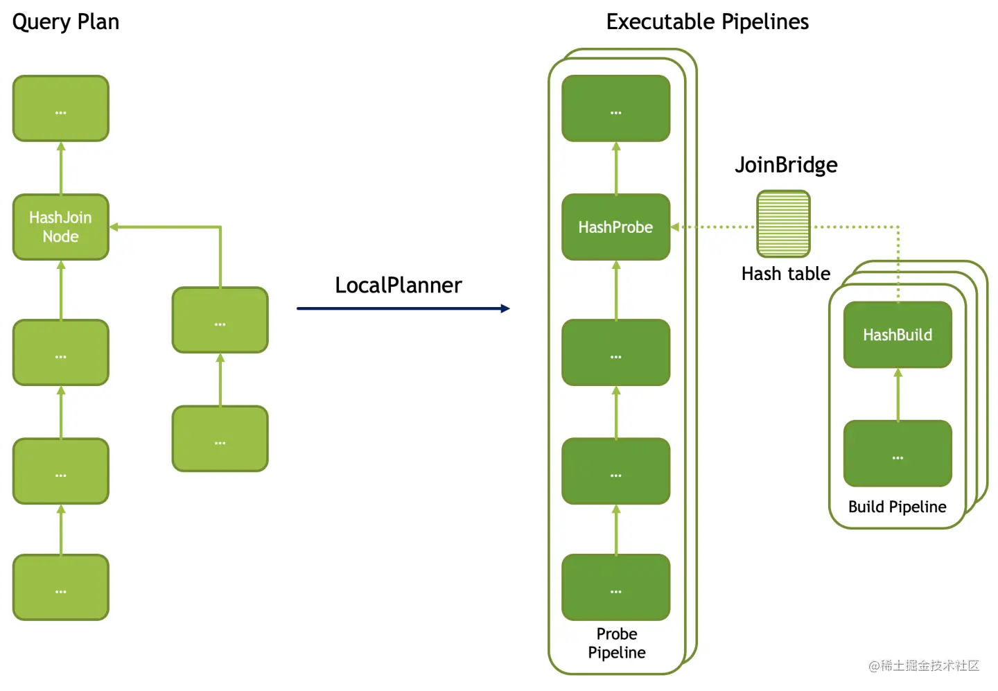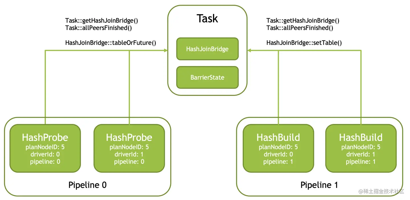 Join (HashJoinNode 和 CrossJoinNode)会翻译成 XXProbe 和 XXBuild 两个算子,并且通过一个共享的 Bridge 来沟通数据,两侧 Pipeline 都可以通过 Task::getHashJoinBridge() 函数来根据 PlanNodeId 获取该共享的 Bridge。
