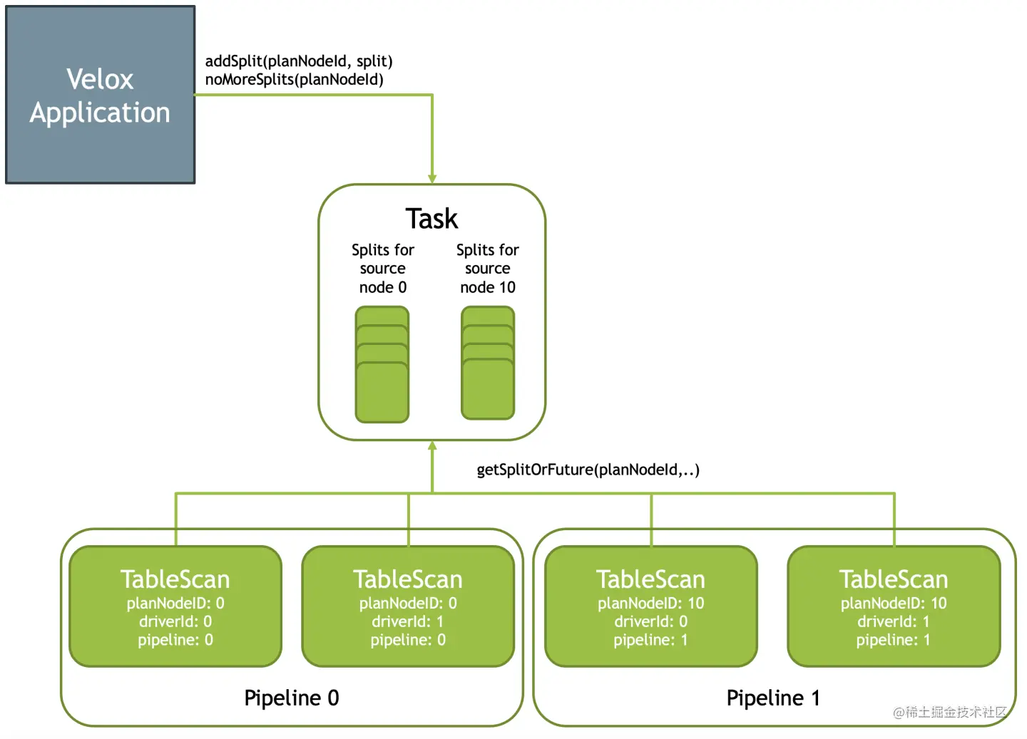 Velox 允许应用层(即 Velox 的使用方)以 Splits (每个算子的输入片段称为 Split)的方式给 Pipeline 喂数据,可以流式的喂,因此有两个 API: