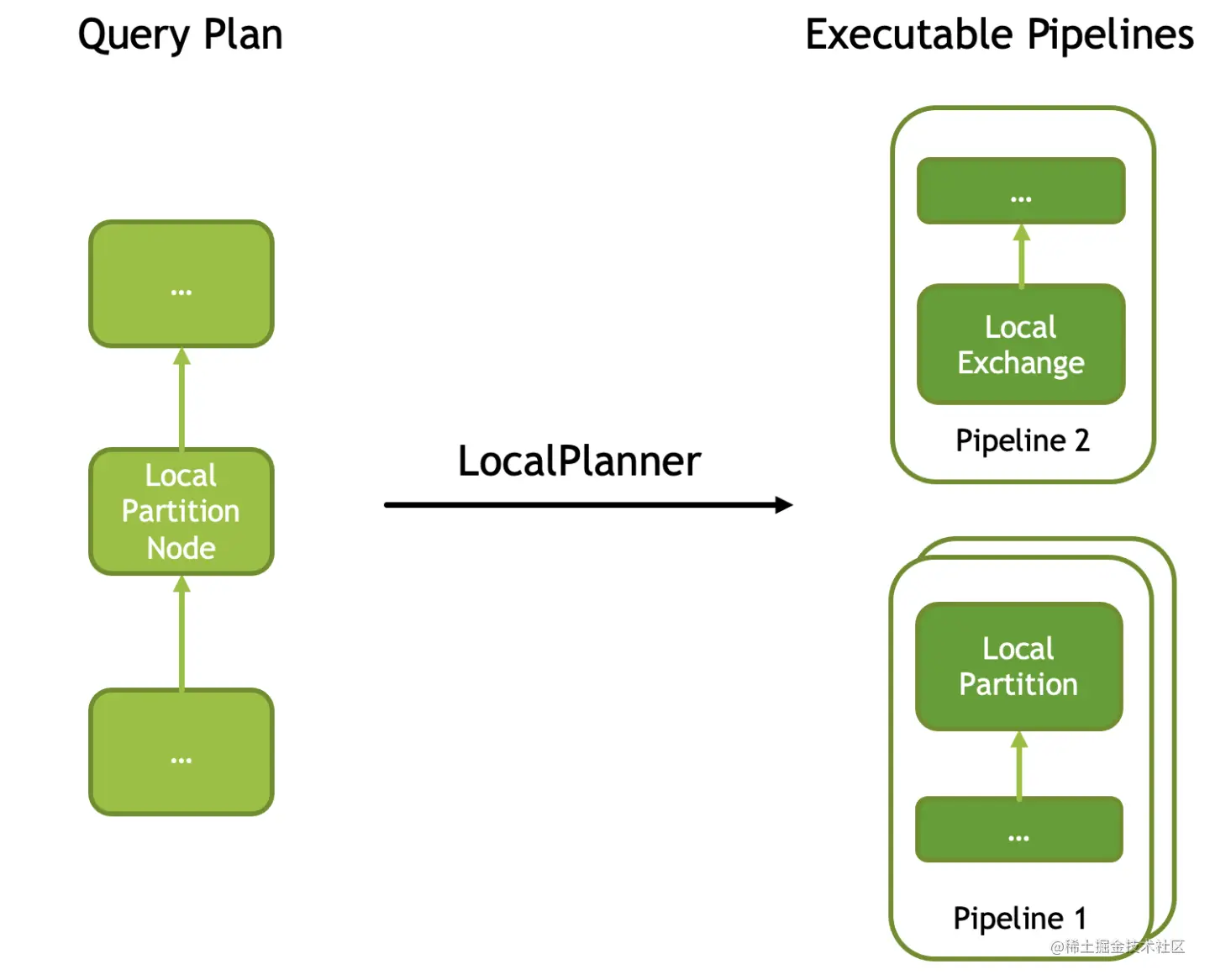 并且,可以由 LocalPartitionNode 来按需改变每个 Pipeline 并行度,其中 Pipeline 的每个线程由一个 Driver 来执行。每个 Driver 也有一个从 0 开始的编号:Driver ID,是 Pipeline 粒度的。