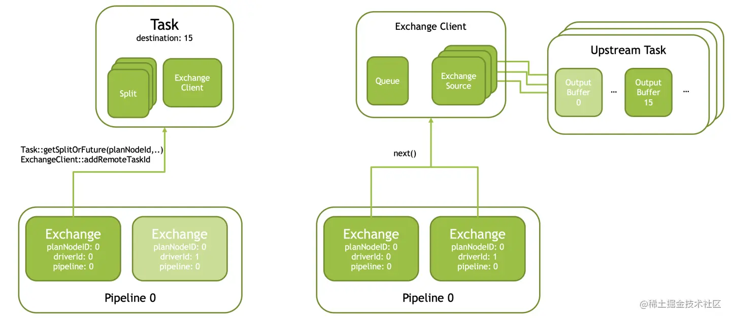 第一步,Pipeline 中第一个 Driver (driverId == 0) 的 Exchange 算子从 Task 中获取一个 Split,并且初始化一个共享 Exchange Client。
