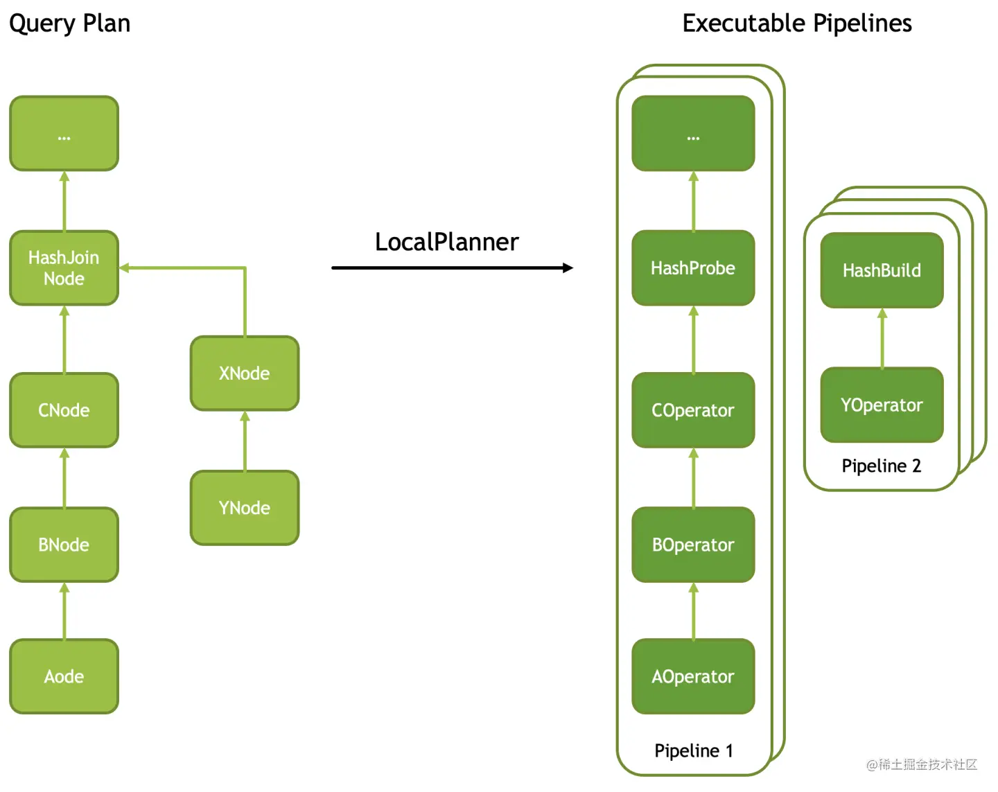 总结一下,上述五个 PlanNode,HashJoinNode,CrossJoinNode, MergeJoinNode ,LocalPartitionNode ,LocalMergeNode 在翻译时会造成切口,即将逻辑 PlanTree 切成多个物理 Pipeline,因此在切口处会将一个逻辑算子翻译成多个物理算子,分到不同 Pipeline 上。每个 Pipeline 会有一个从 0 开始的编号:Pipeline ID,是全局粒度的。