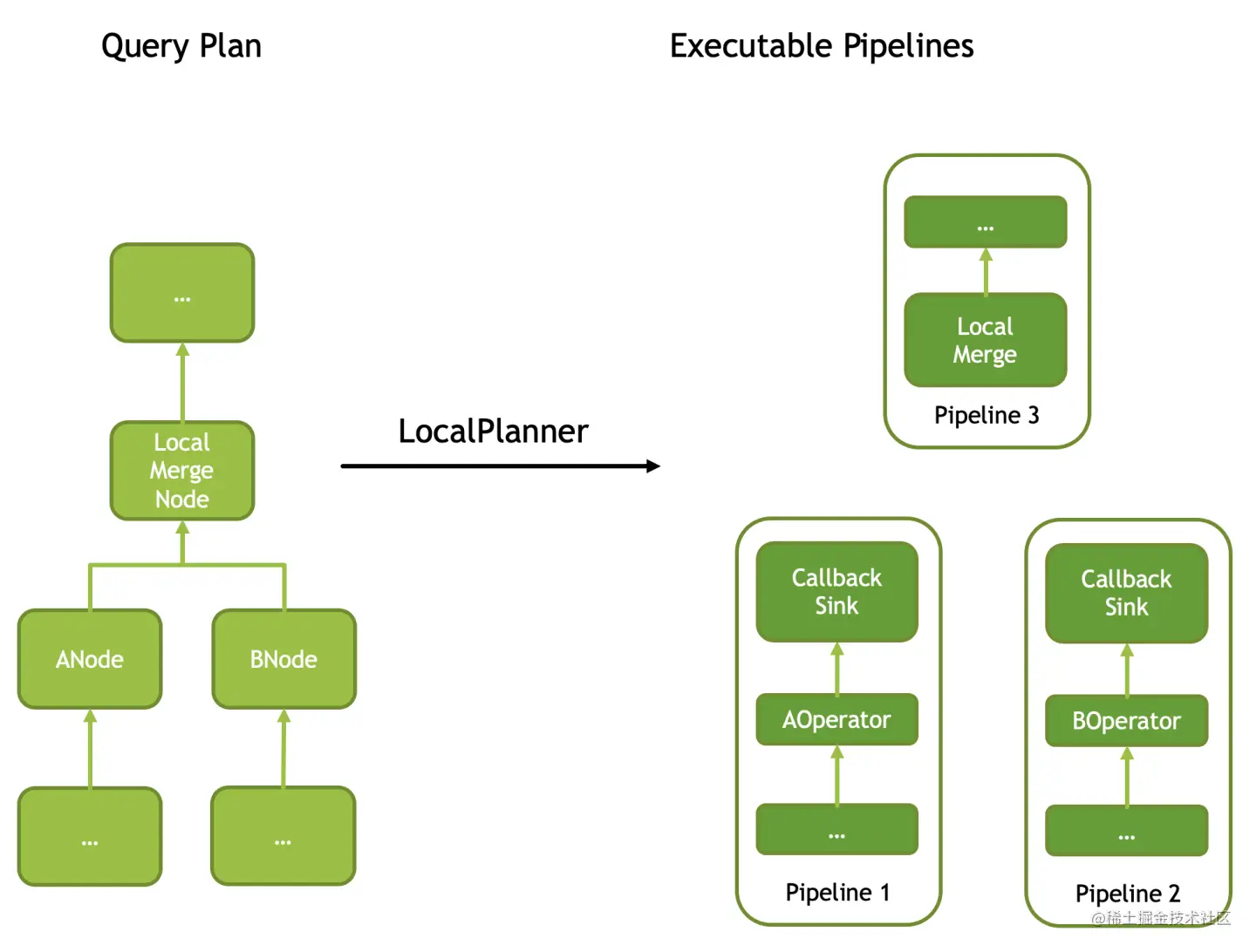 还有一个特殊节点,称为 LocalMergeNode,该对输入有要求:必须有序,然后会进行单线程的归并排序,从而使输出全局有序。也因此,由其而切开的消费 Pipeline 一定是单 Driver 的。翻译成算子,对应两个 CallbackSink 和 LocalMerge。