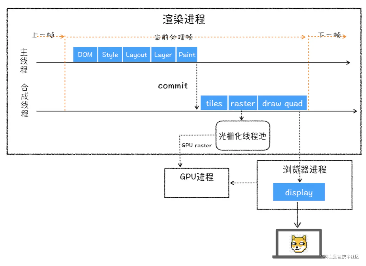 一旦所有图块都被光栅化,合成线程就会生成一个绘制图块的命令——“DrawQuad”,然后将该命令提交给浏览器进程。