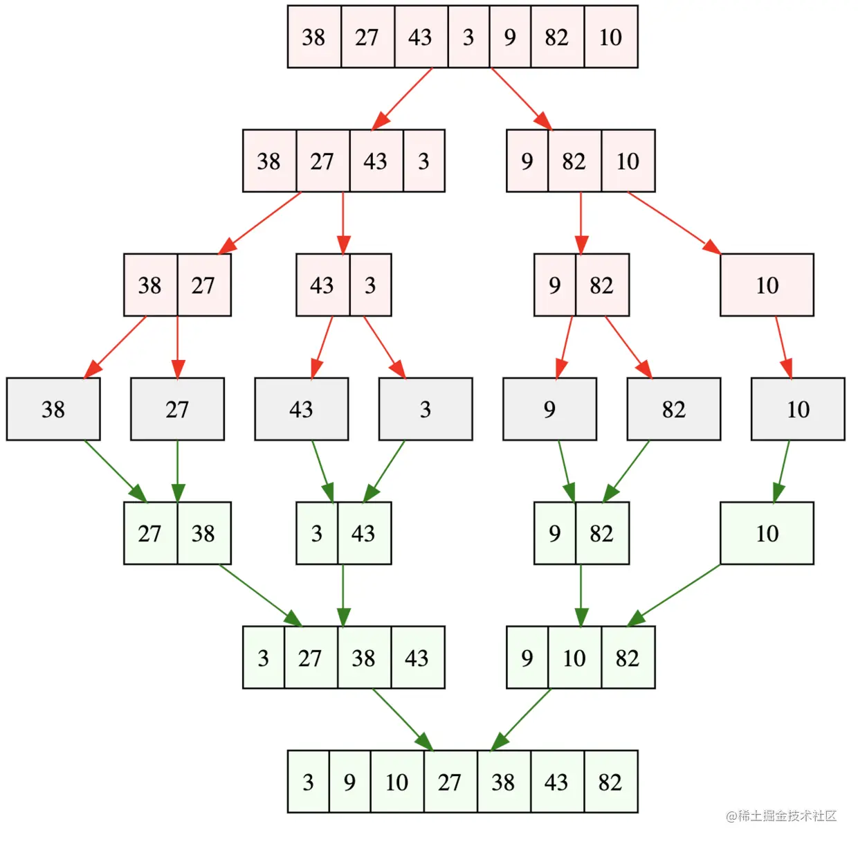 - 将长度为n的数组不断均分(1分为二,二分为四,...),最后分成二或一项