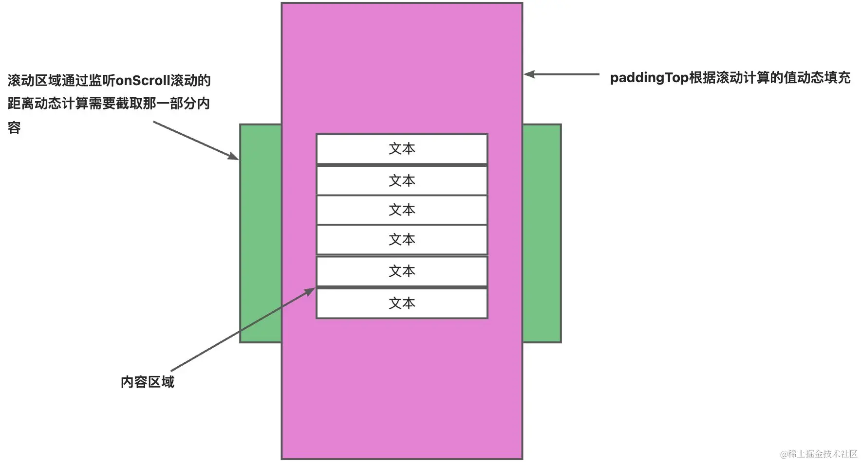 onScroll事件监听容器元素的滚动事件,并根据滚动位置计算可见列表项的起始索引。具体地,使用scrollTop属性获取容器元素的滚动位置,然后将滚动位置除以每个列表项的高度并取整数部分,即可得到可见列表项的第一个索引。将该索引设置为起始索引即可。 -