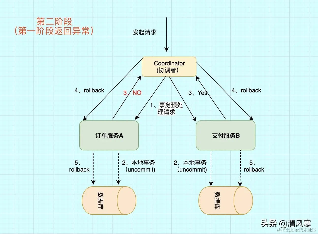 异常条件:任何一个 参与者 向 协调者 反馈了 No 响应,或者等待超时之后,协调者尚未收到所有参与者的反馈响应。