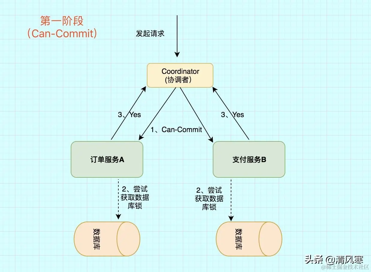 之前2PC的一阶段是本地事务执行结束后,最后不Commit,等其它服务都执行结束并返回Yes,由协调者发生commit才真正执行commit。而这里的CanCommit指的是 尝试获取数据库锁 如果可以,就返回Yes。
