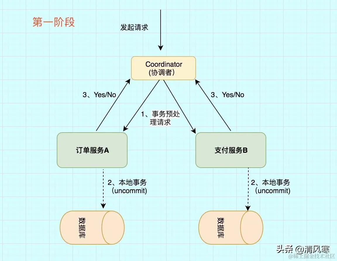 两个阶段:第一阶段:投票阶段 和第二阶段:提交/执行阶段。举例 订单服务A,需要调用 支付服务B 去支付,支付成功则处理购物订单为待发货状态,否则就需要将购物订单处理为失败状态。