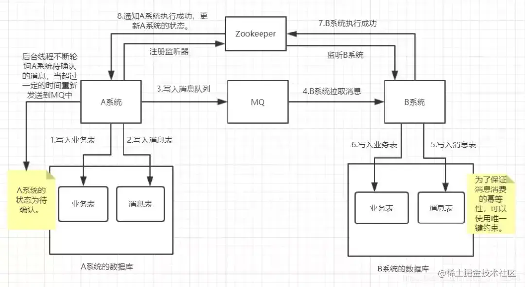 当B系统执行成功之后,需要通知A系统执行成功,此时可以使用一个监听器,如Zookeeper,ZK监听到执行成功更新A系统成功。然后开始发送下一条消息。