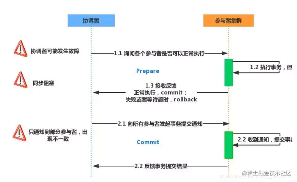 - 同步阻塞:所有的参与者都是事务同步阻塞型的。当参与者占有公共资源时,其他第三方节点访问公共资源不得不处于阻塞状态。