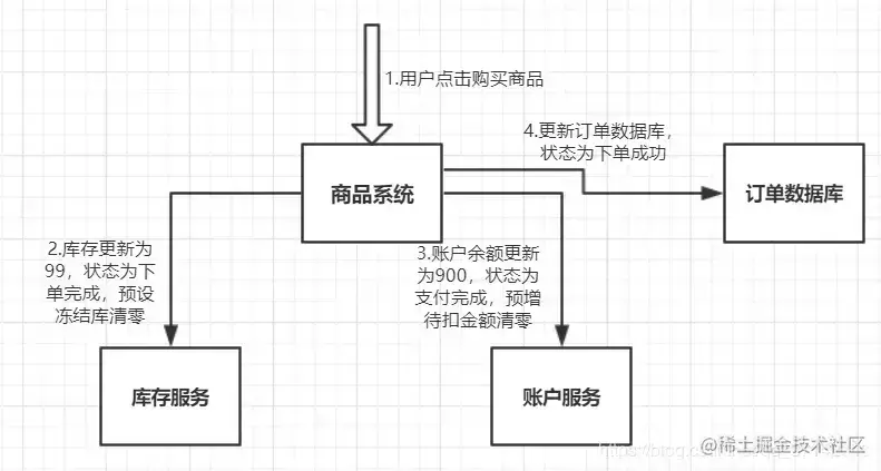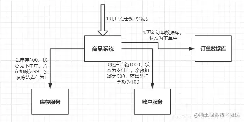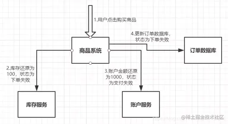在用户整个购买商品的过程中,我们需要保证事件1,2,3在没有异常的情况下全部执行成功,一旦某个系统抛出异常,都需要回滚。