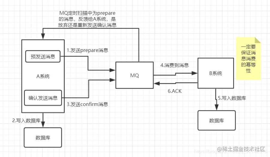 需要注意的是,该方案中,在A系统中,我们首先写入业务表,然后写入消息表,然后将消息发送到MQ中,在B系统中需要先写入消息表,这是为了保证消息重复消费,为了保证消息消费的幂等性,我们可以使用数据的唯一键来约束。