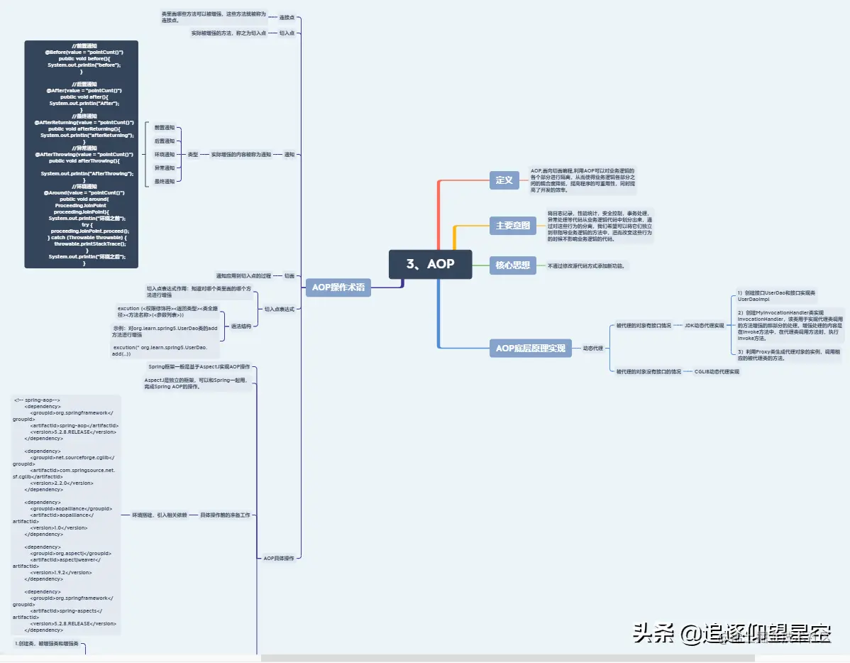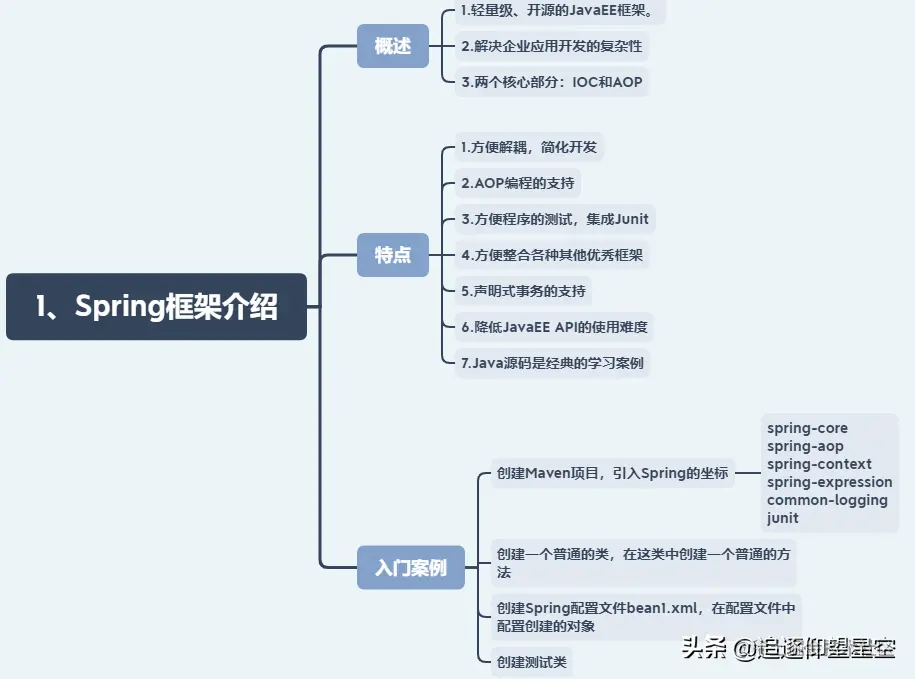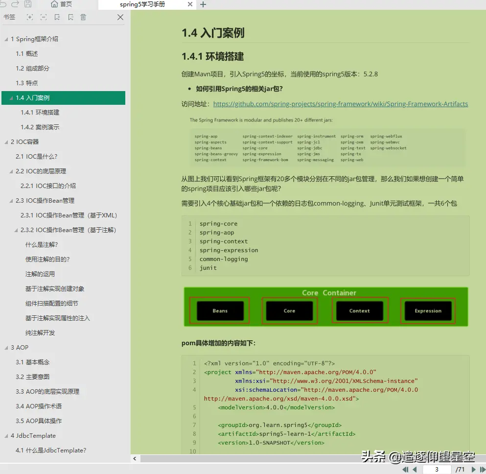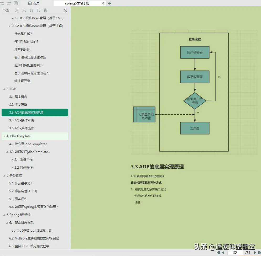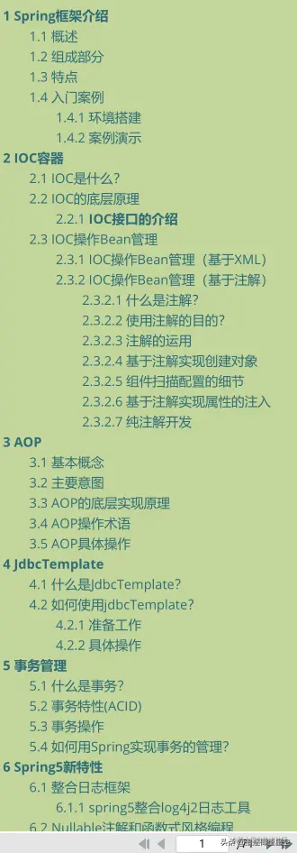 以上所绘的Spring5的架构脑图其实就是对这份Spring5学习手册的理解,每个部分都有其对应的架构知识导图作为梳理的笔记,下图则是整个手册的全目录。