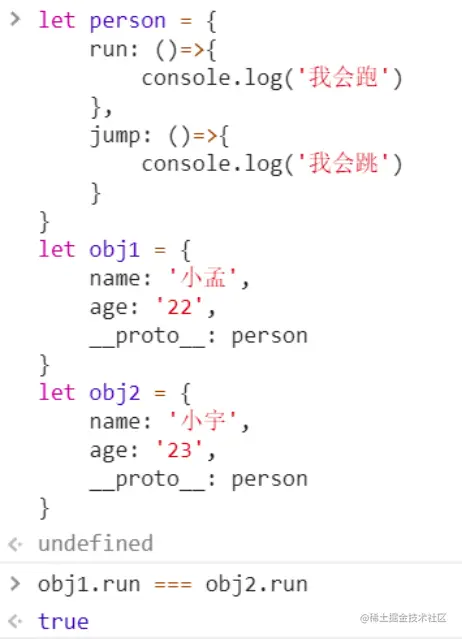 创建的两个对象都是中国人,姓名和年龄不一样,跑方法和跳方法也不一样,如果这样创建一百人甚至一千人的话,会很耗费内存,而且代码会很冗余,所以JS之父想了一个办法,把跑方法和跳方法这类的共同属性包含在一个隐藏属性里,在每次创建对象的时候就把这个隐藏属性自动复制在这个对象上,这个隐藏属性的名字就叫原型,它储存着一个对象的地址,这个对象里就有他们的共有属性