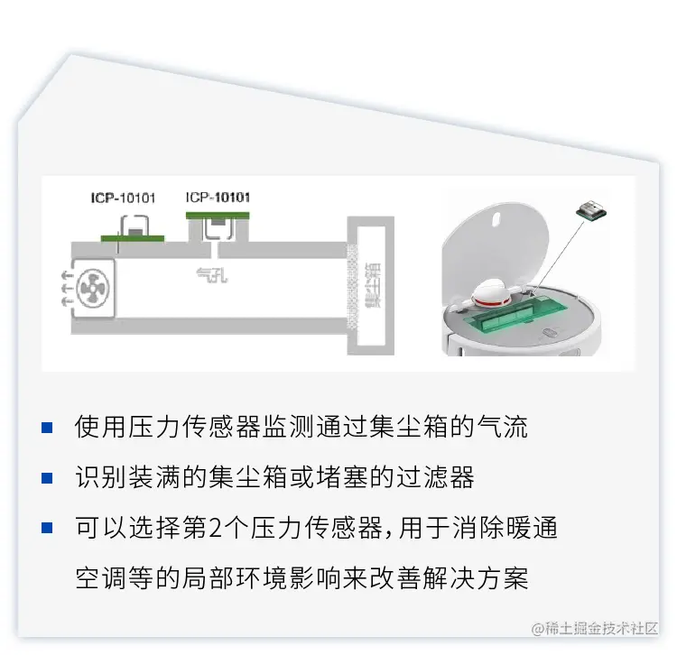 使用压力传感器监测通过尘盒的空气流量,可以估算出尘盒内的垃圾积存情况。TDK的气压传感器ICP-10101适用于此类应用。当检测到尘盒内的气压下降时表明尘盒已满,此时可触发扫地机器人停止工作并返回充电座。找正品元器件,上唯样商城,一些高端充电座具有自动清扫尘盒功能,尘盒被清理后,扫地机器人便可回到其最后停止工作的位置并继续清扫。