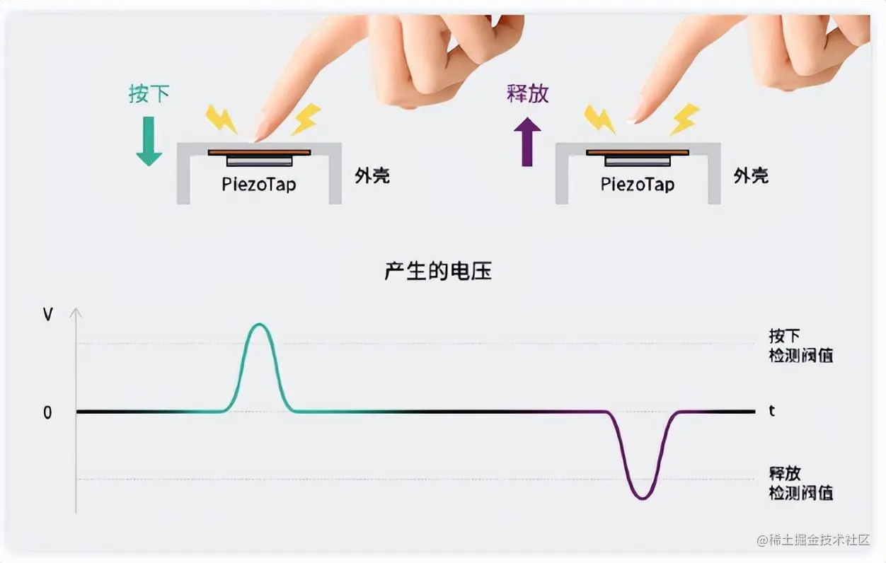 压电效应是一种通过对压电元件 (如石英晶体或某些类型的陶瓷) 施加压力产生机械变形而产生电压的现象, 压电元件可以检测到触碰产生的微小应力。