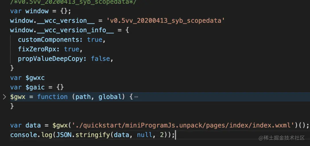 它会声明一个 $gwx 函数,通过它可以得到 Virtual DOM。接着我们在这个文件里添加几行代码去调用它,并通过 Node.js 或者 NW.js 执行这个文件: