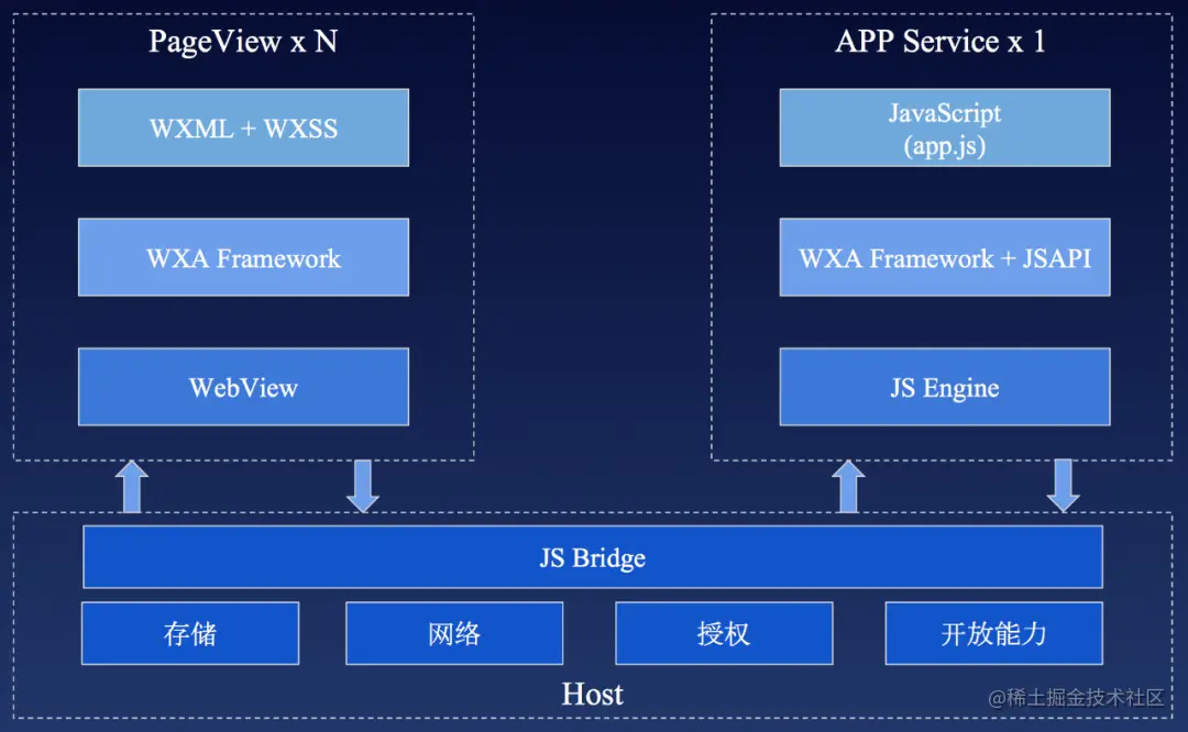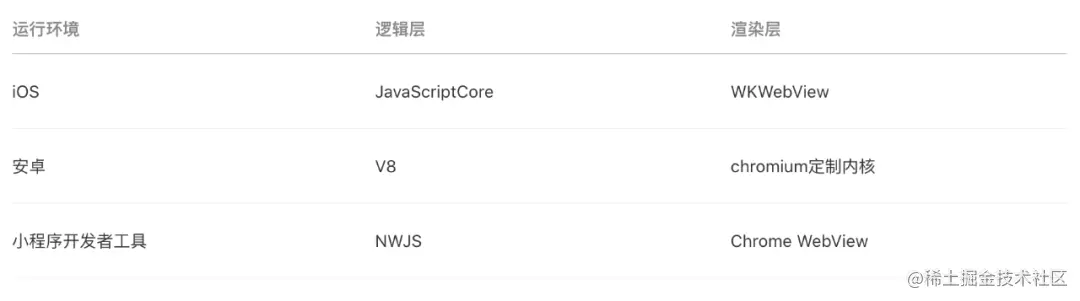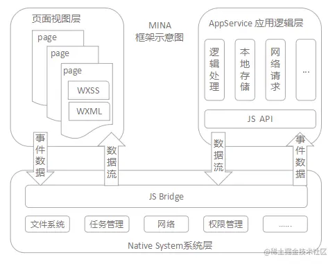 小程序逻辑层和渲染层的通信会由 Native (微信客户端)做中转,逻辑层发送网络请求也经由 Native 转发。