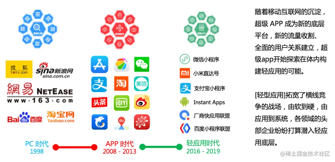 - 小程序其实也是一种 hybrid 技术,但是他围绕宿主应用,实现了更为强大的生态,提供更为便捷的服务。