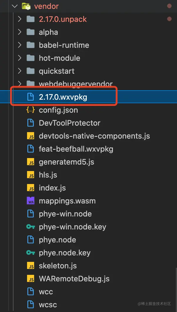 源码中有一个 vendor 文件夹是值得注意的,通过它可以快速新建一个示例项目,同时里面有一个十分重要的 2.17.0.wxvpkg 包,它是微信小程序的基础库,包含了下文所提及的 WebService 与 WebView 等逻辑层与渲染层的处理。